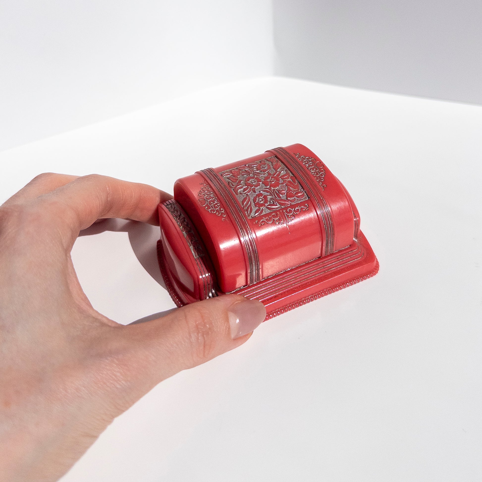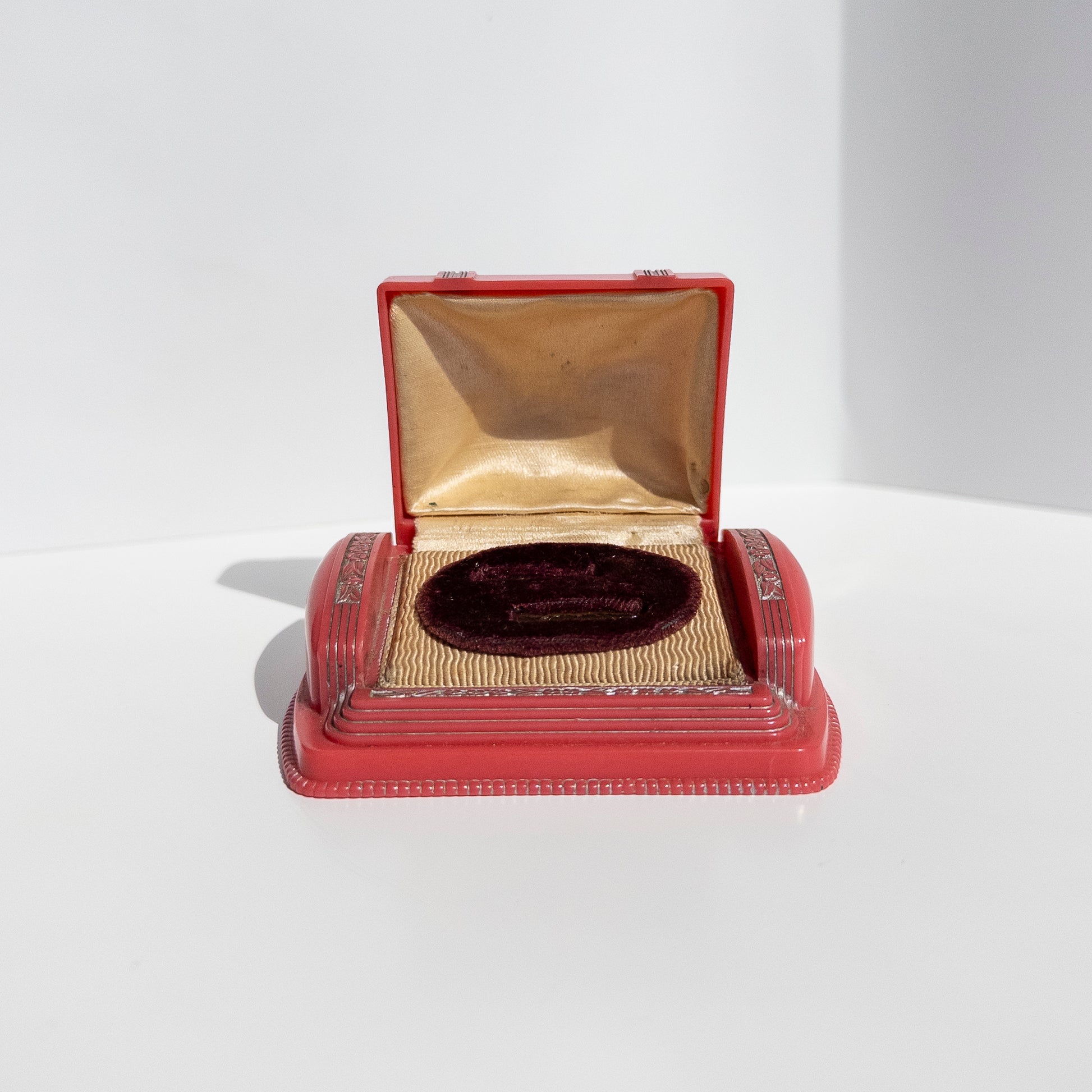 Vintage/Art Deco Red Celluloid Ring Box - Cream satin and brown velvet interior.